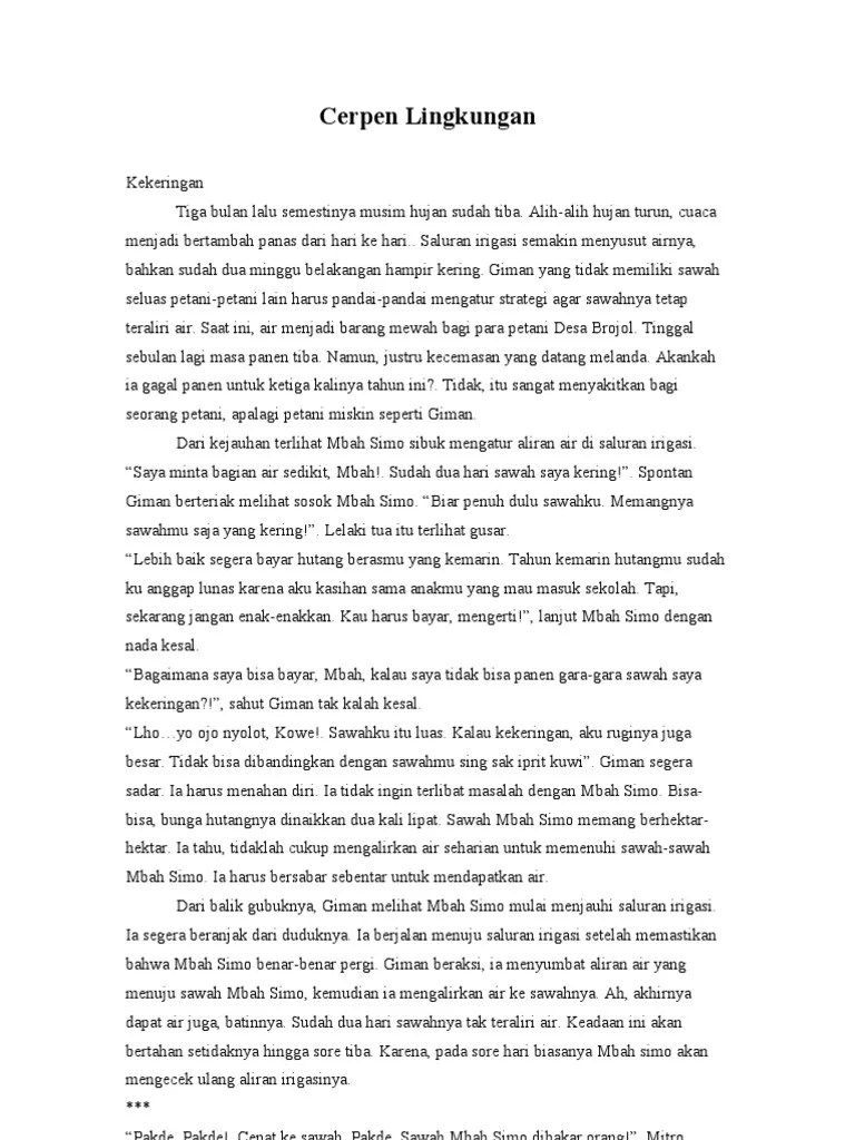 Setelah meminum teh buatan alisya, ia bercerita tentang kondisi lingkungan alam desa saat ia masih muda. Maka dari itu, pentingnya kita menyadari . Kumpulan cerpen lingkungan terbaru hasil karya para sahabat cerpenmu, puluhan ribu cerita pendek cerpen telah diterbitkan disini! Oke deh, kamu simak kisahnya di bawah ini! Contoh karangan persuasi · contoh karangan argumentasi · proposal · contoh cerpen . Contoh cerita untuk anak tk tema lingkungan. Walaupun temanya masih tentang lingkungan sekolah. Contoh cerpen singkat tentang lingkungan cerpen adalah kependekan dari cerita pendek yang secara singkat diartikan sebagai sebuah bagian dari . Pelestarian dan pencegahan krisis ekologi dan lingkungan merupakan. Contoh, tidak membuang sampah sembarangan agar tidak terjadi banjir, menebang pohon sembarangan, dan masih banyak lagi. Contoh cerpen bertema lingkungan terbaru 2014 pada kesempatan kali ini saya akan share sebuah cerpen yang tema nya lingkungan nah. Pertama, menganalisis dan mendeskripsikan tanggapan mahasiswa melalui penentuan tema dan penokohan dalam cerpen asa dan hutan . Manusia dan lingkungan dalam kumpulan cerpen.